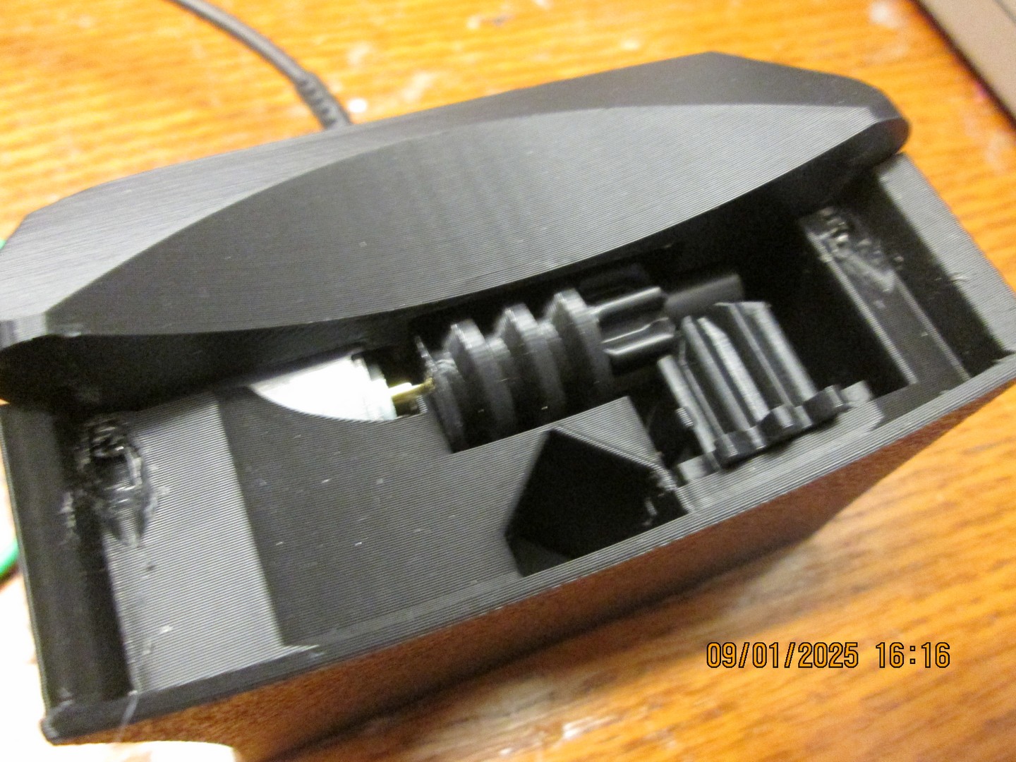 This was the first time I printed in two colours (for the same part). The two gears inside didn't print well and were very rough on the surface, so I reprinted with finer resolution, and in different orientation to get a nice smooth gear surface.