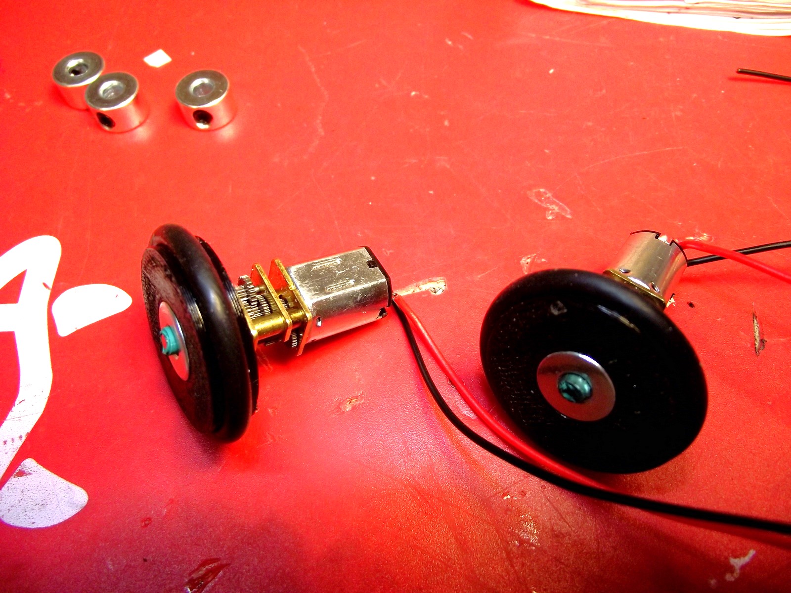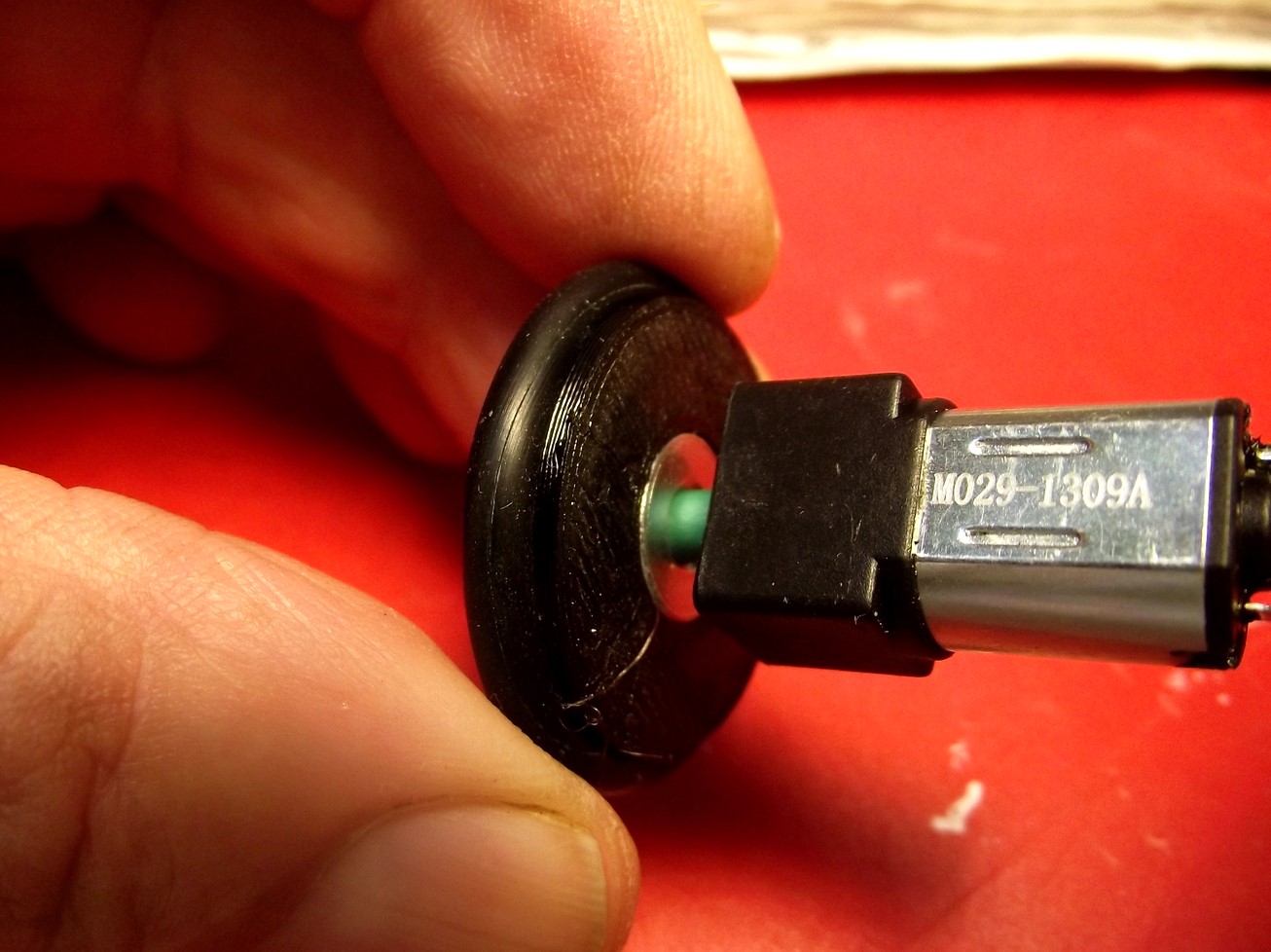I always had a problem with small motors and wheels, finding a way to attach them. I 3D printed a pulley from Thingiverse and put a tight fitting o-ring around it, then press-fitted it onto the wheel.