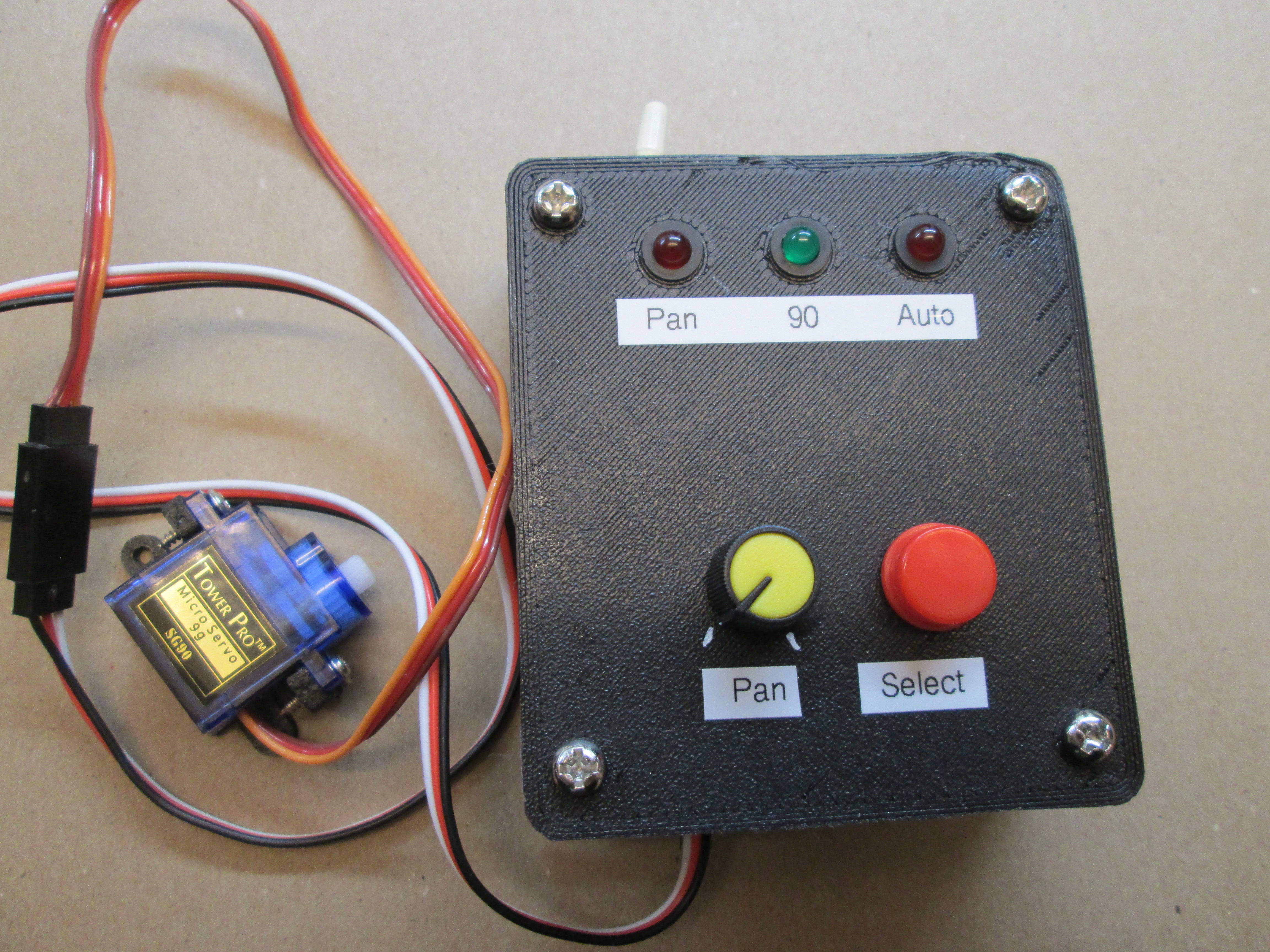 Batteries are inside so I no longer have to hook up power to the little blue guy, the LEDs are larger, the pushbutton is larger. I attached a long servo cable instead of using the 3 male pins shown above. The small tester was hard to use. In addition to the LEDs and pushbutton, the entire device was too small, and the plastic covering was very slippery.