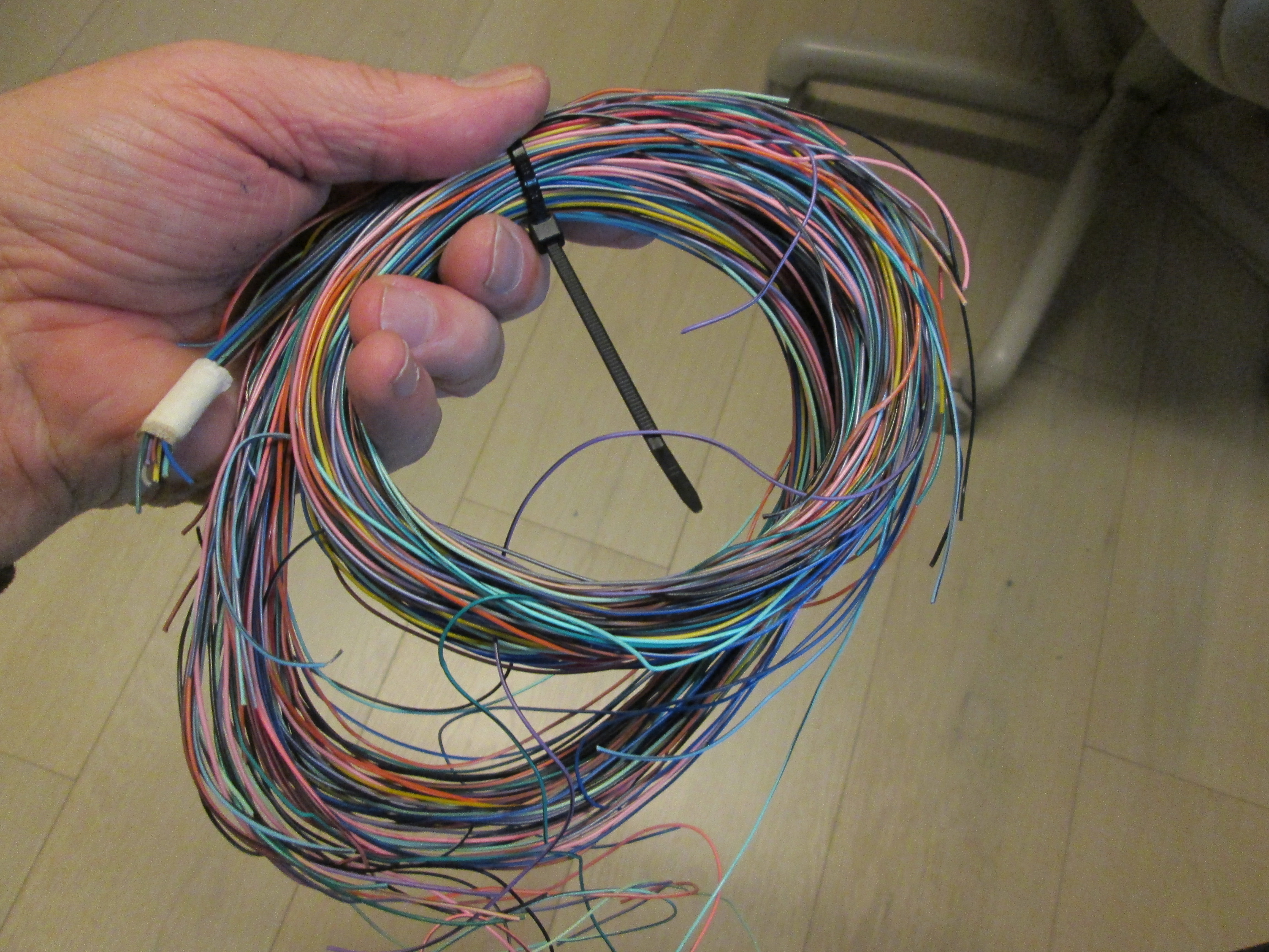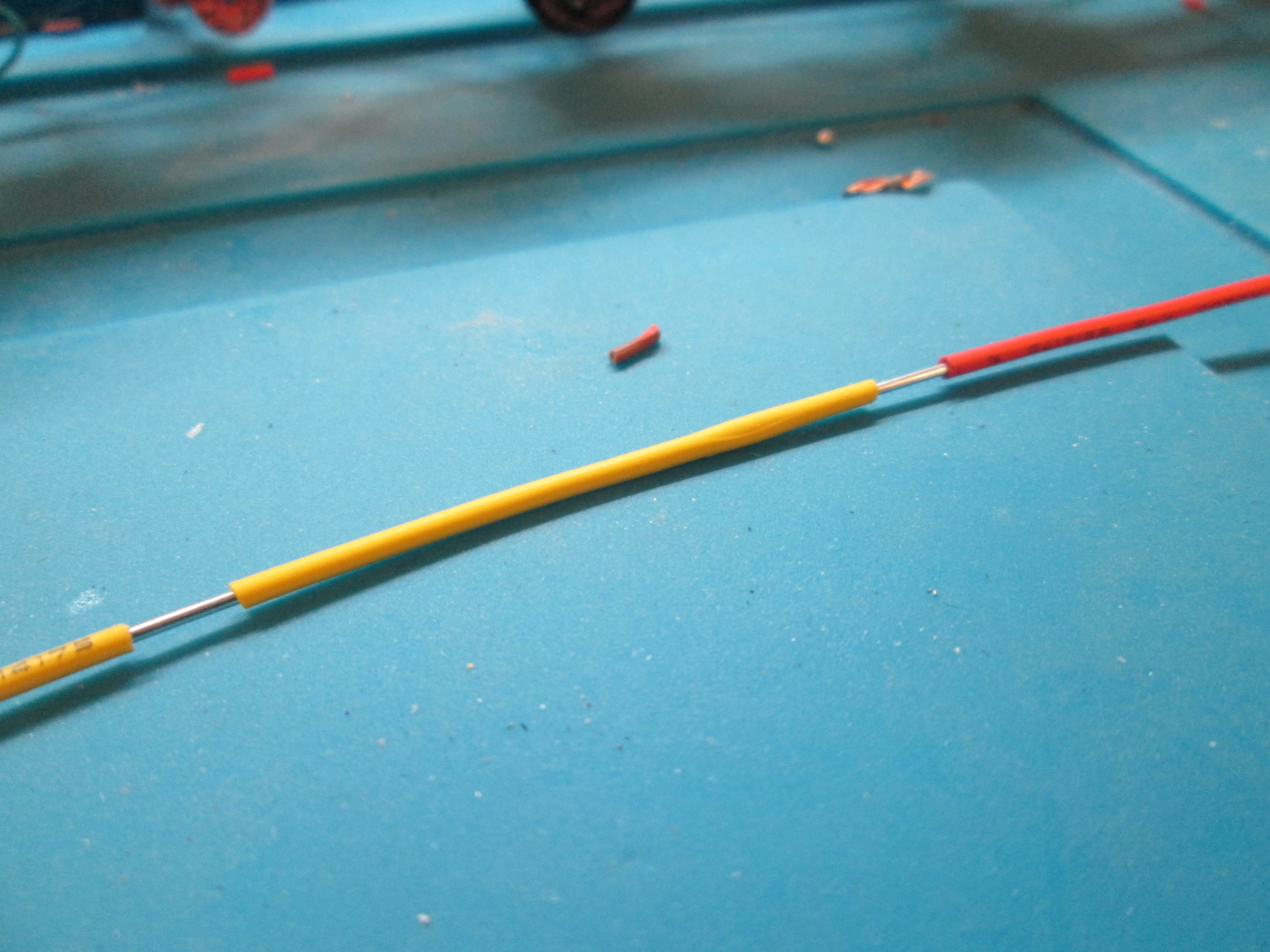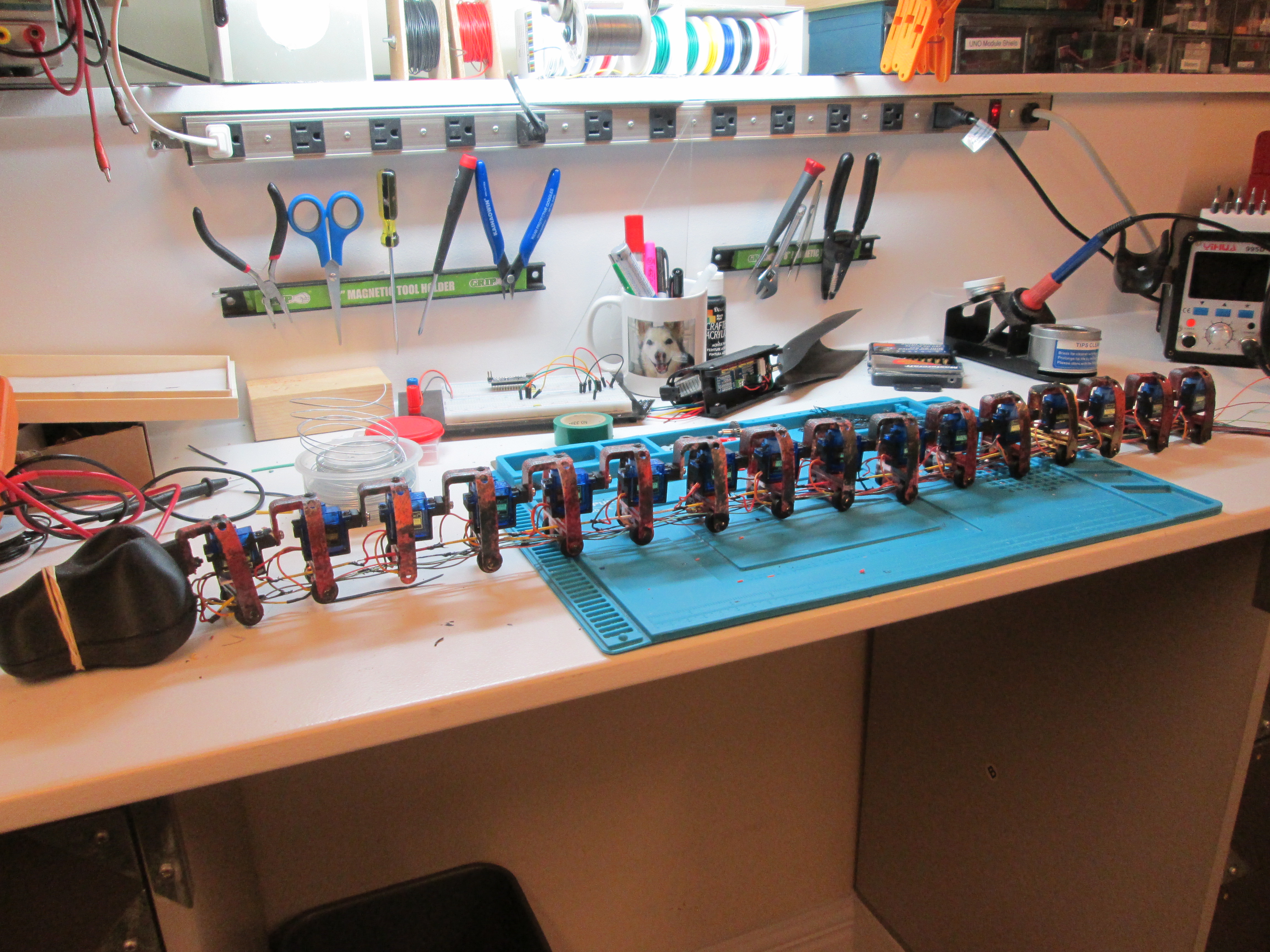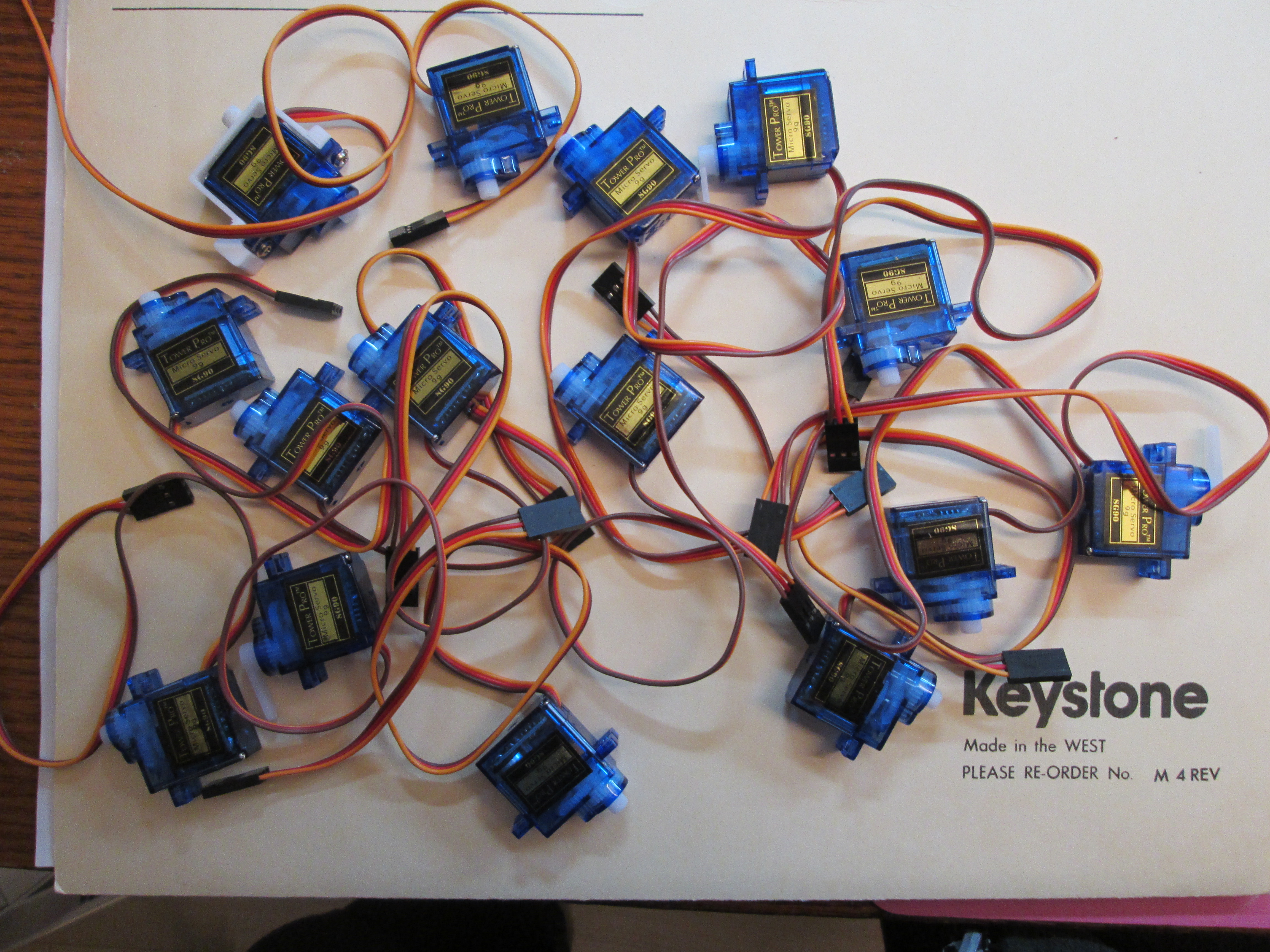 - Each servo/rib requires 3 wires but that would be too many to string from head to tail, so I used 16 small (AWG 24) for the servo signal, and two bus wires for +V and common. Initially I used a solid wire but that put too much stress on the servos and the snake would not "slither", so I removed it and used a flexible wire with heat shrink protecting the parts I didn't want to connect to the ground bus which was one unprotected (no insulation) wire. The result was only 18 wires were required. (19 if you count the proximity switch in the head.)