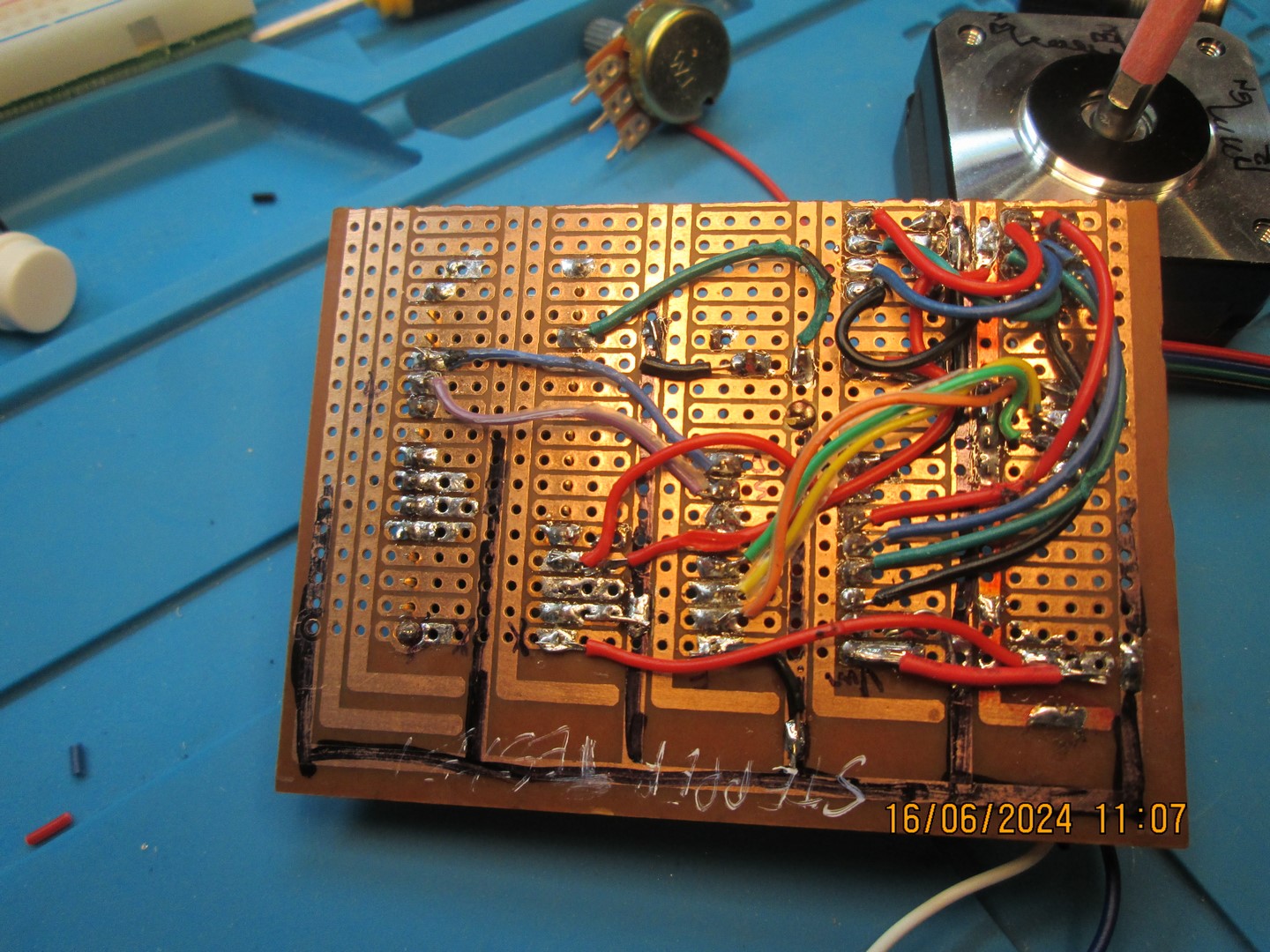 My first build was to make something simple, on perfboard, using the venerable stepper motor controller, the A4988. That was a disaster. So many wires that were hard to implement, then to troubleshoot. When it didn't work, I was so disgusted with it that I threw it in the garbage, scrounging the usable parts.