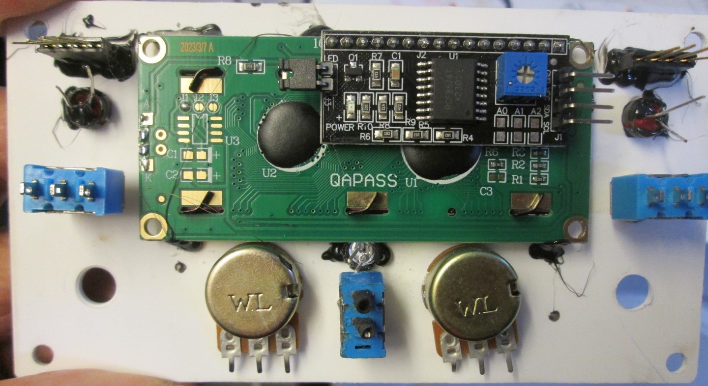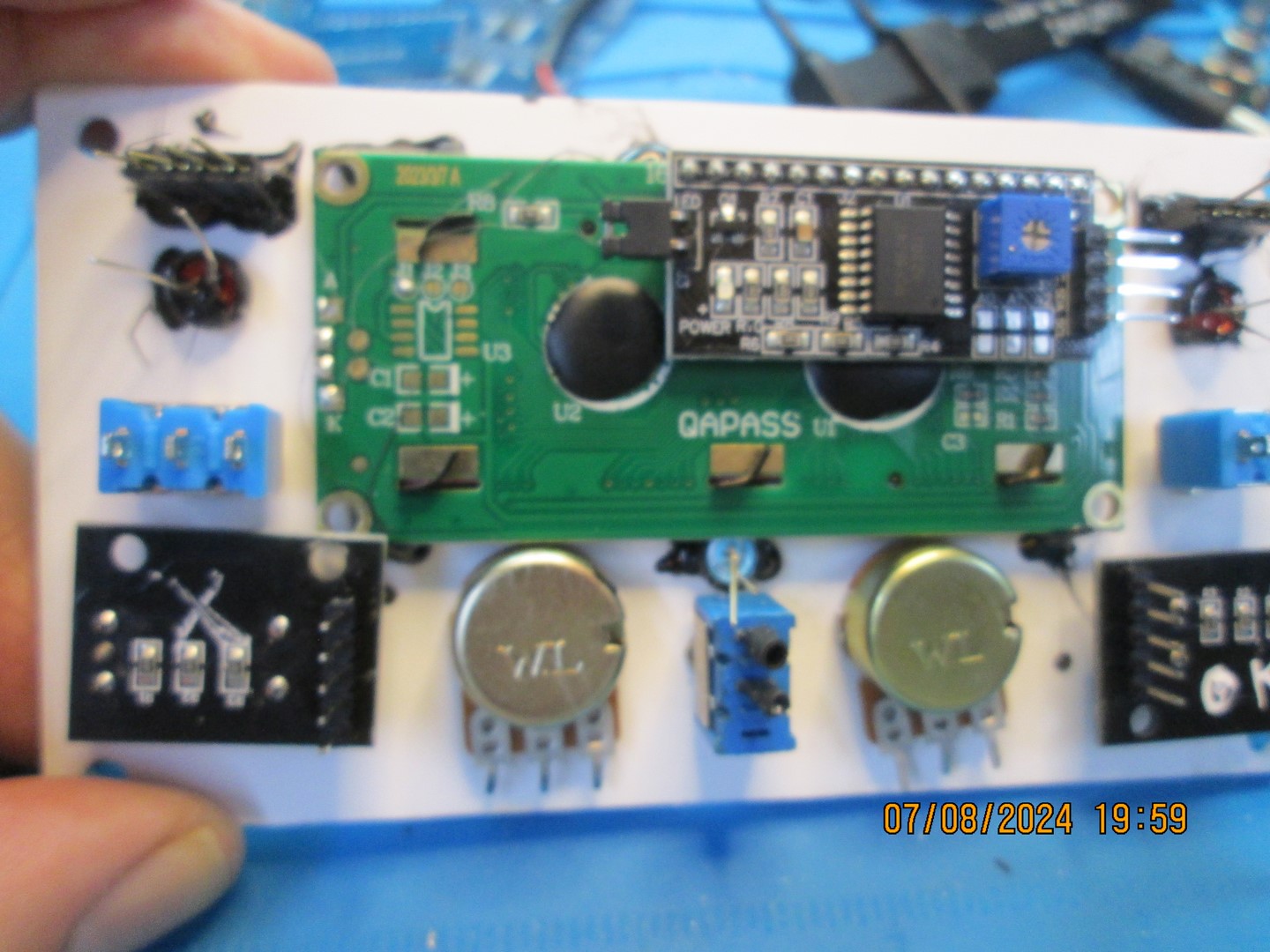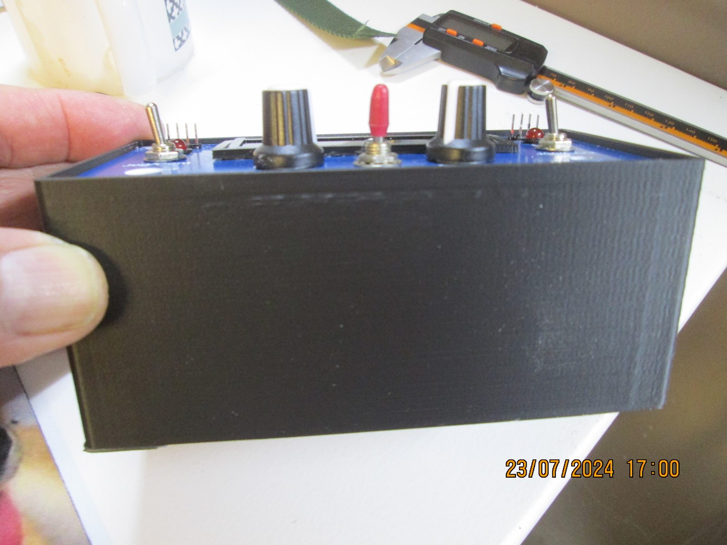 I played around with a PCB design where all the parts would be on the PCB: 2 LEDs, 2 mode switches, 2 pots, 2 rotary encoders, a power switch, an LED power indicator and an LCD display. Not to forget the two 1x4 male JSC connectors that attach to the stepper motors. The problem with this is that all the parts are different heights, so a top that would fit over these parts could not unless all the parts were the same height. For a couple of switches, this would be no problem, but there are too many parts to modify in order to have the cover fit.