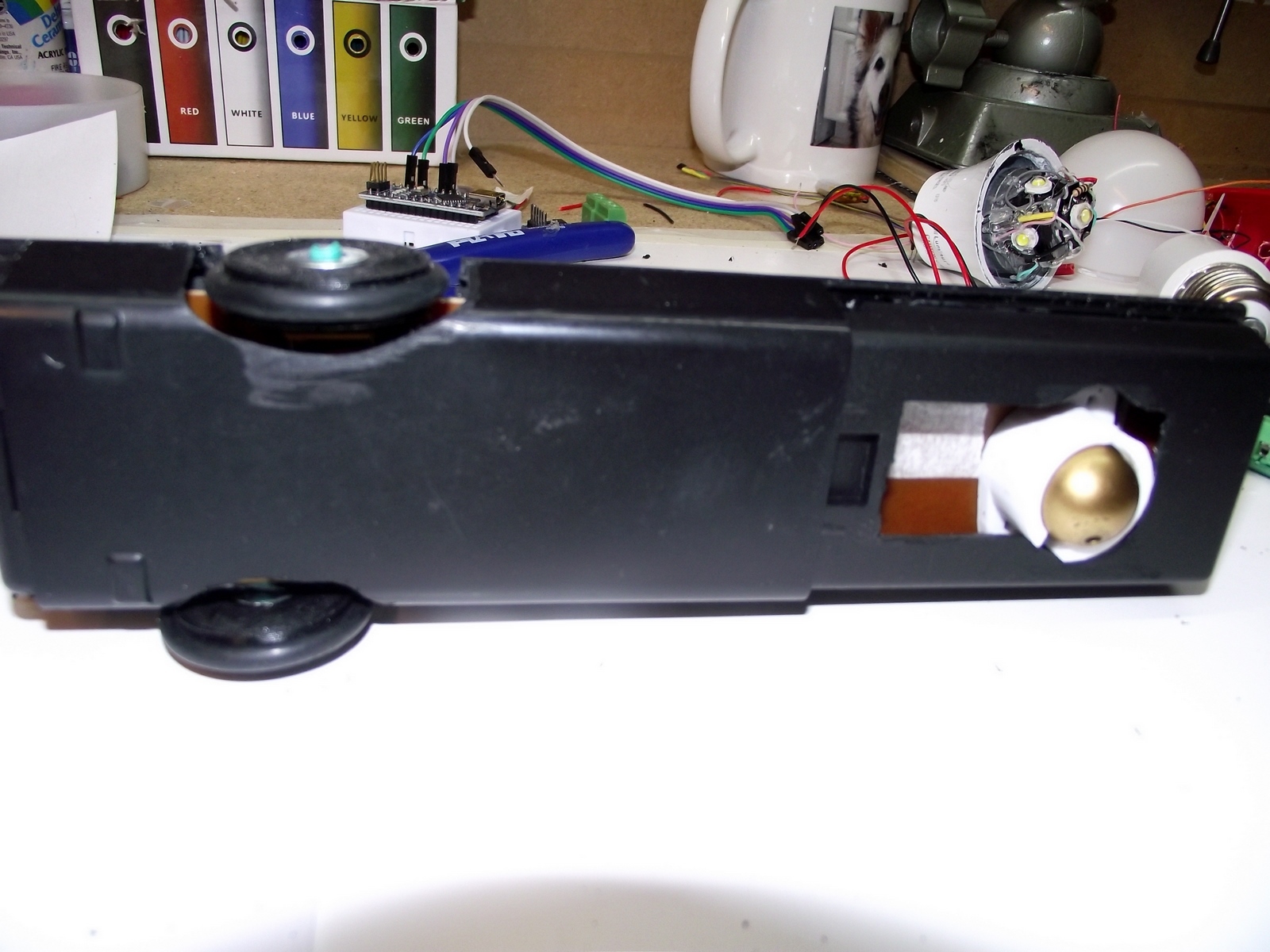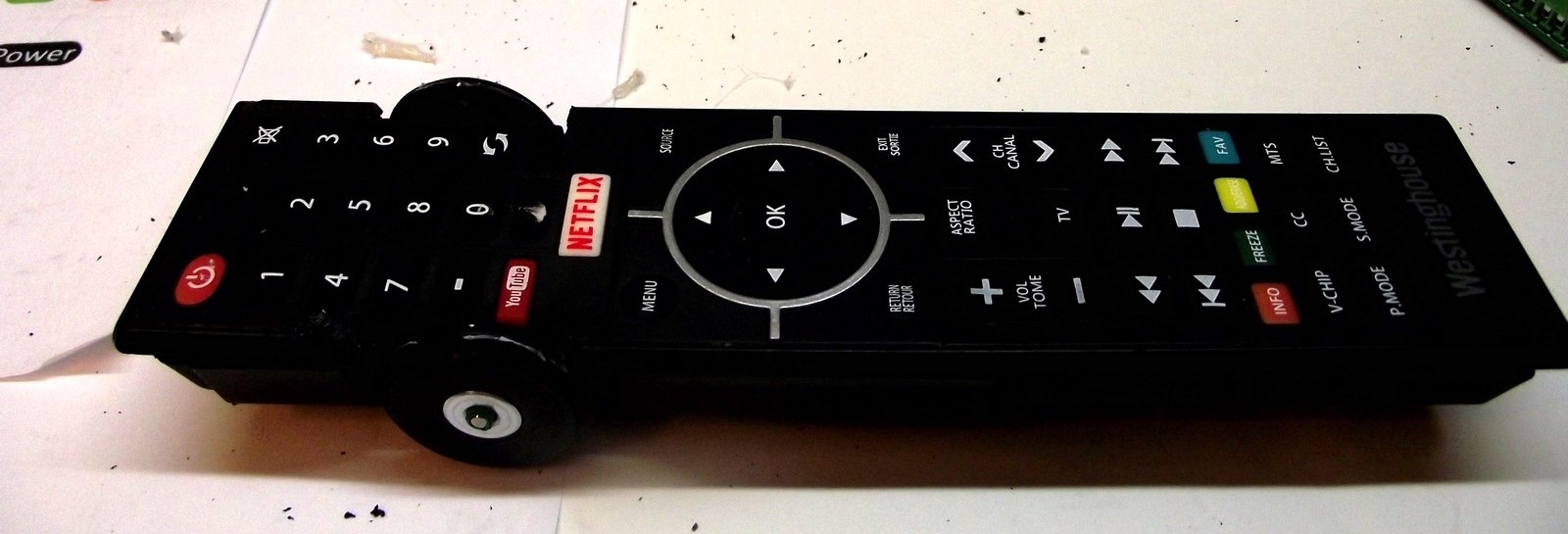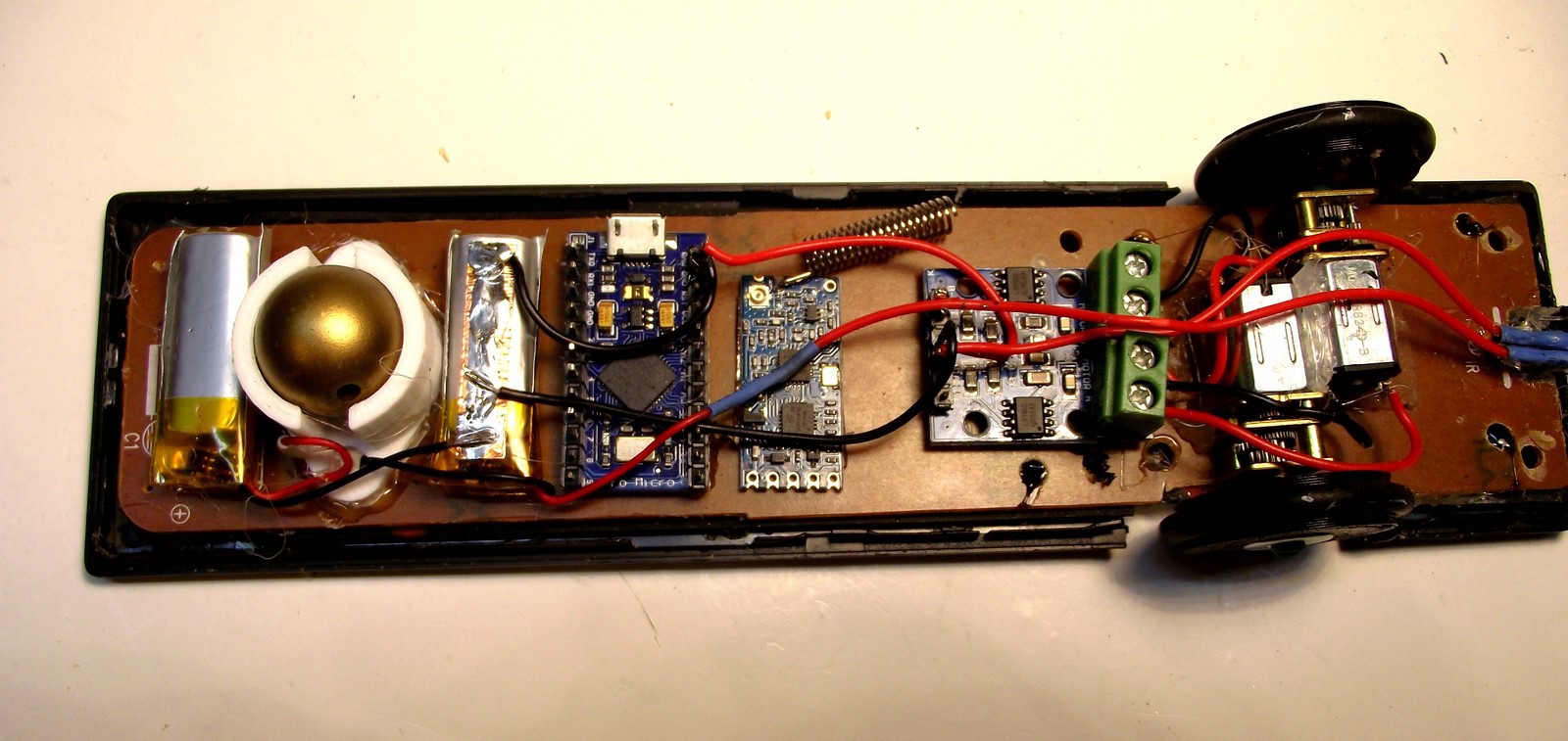 This job was somewhat challenging because of the "thinness" of the remote control. Also since the width was fixed and I wanted to wheels to not stick out, I had to offset the wheels because of the gear motors inside. Looks weird, but it works.