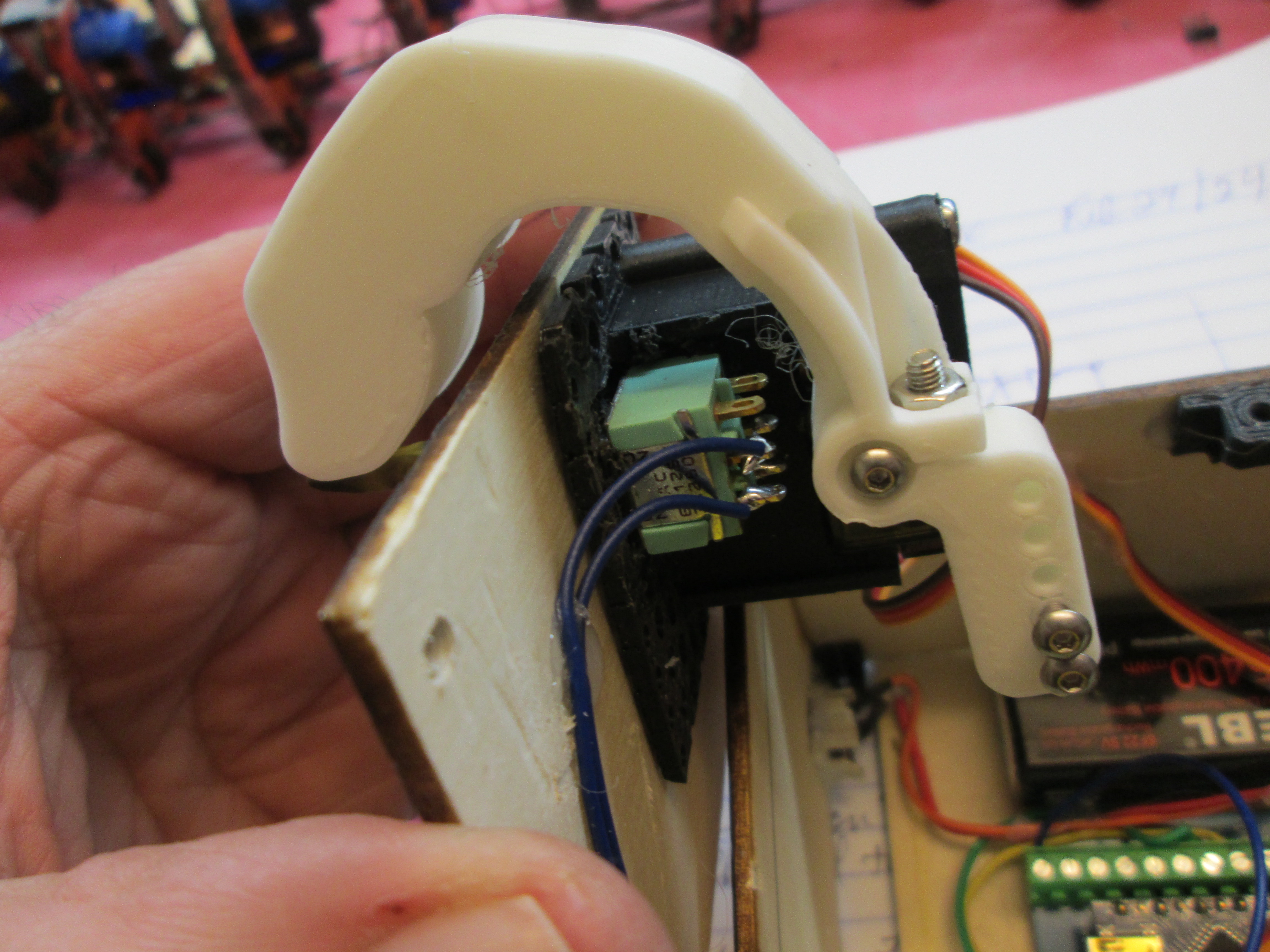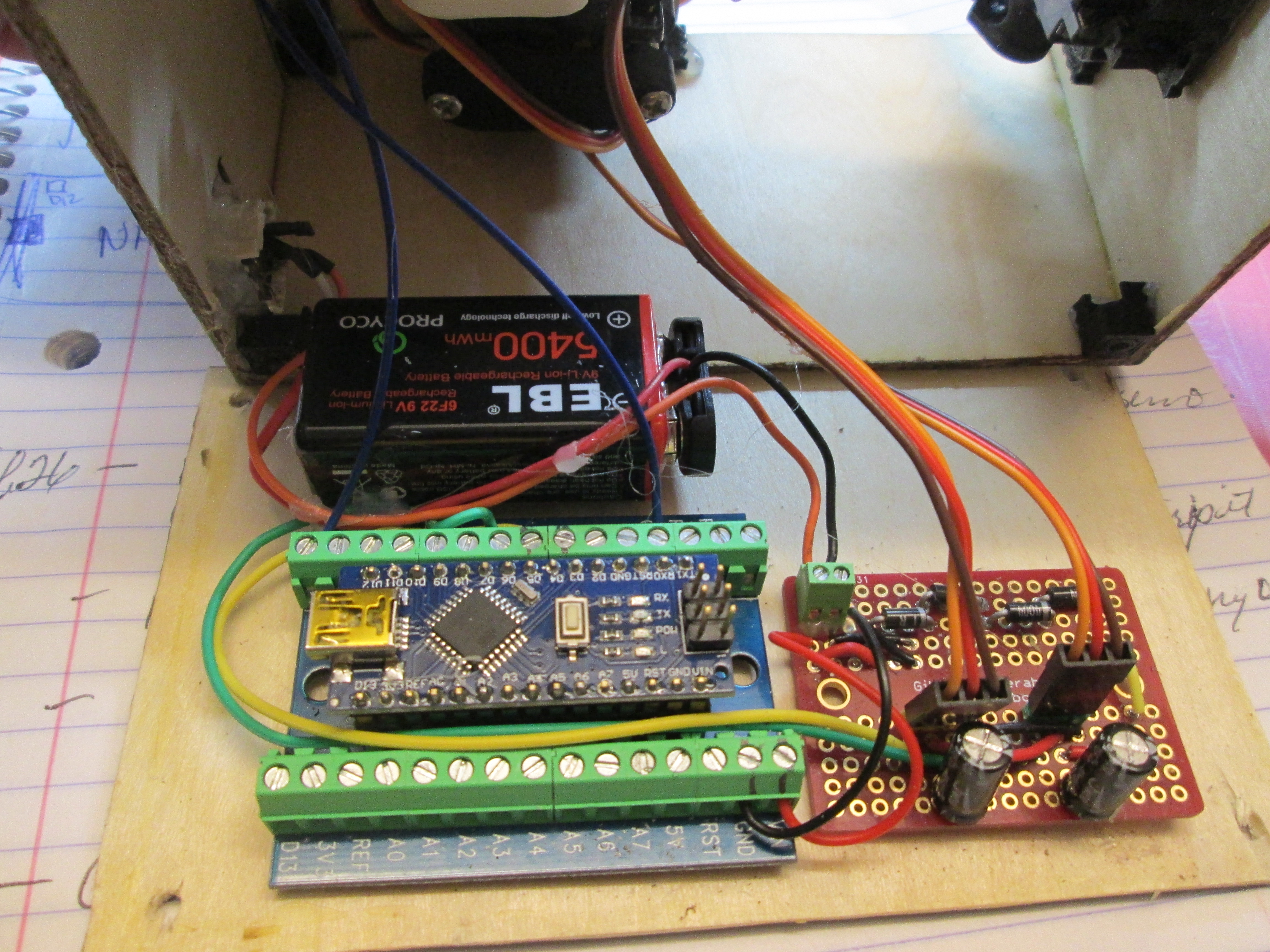 - I have 4x1n4007 diodes in series instead of three to drop the voltage from 9 volts down to around 6 volts for the servos.