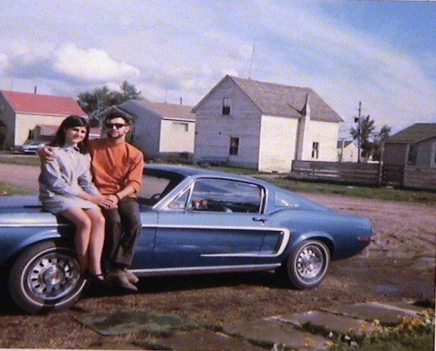 Many of you know what this looked like. 302 CID, blue with white racing stripe. Ordered from factory when I was 18 for $3800. (A Shelby at the time was $5200). Burned in garage fire after I sold it to my twin brothers-in-law. Photo of me and girlfriend/wife.